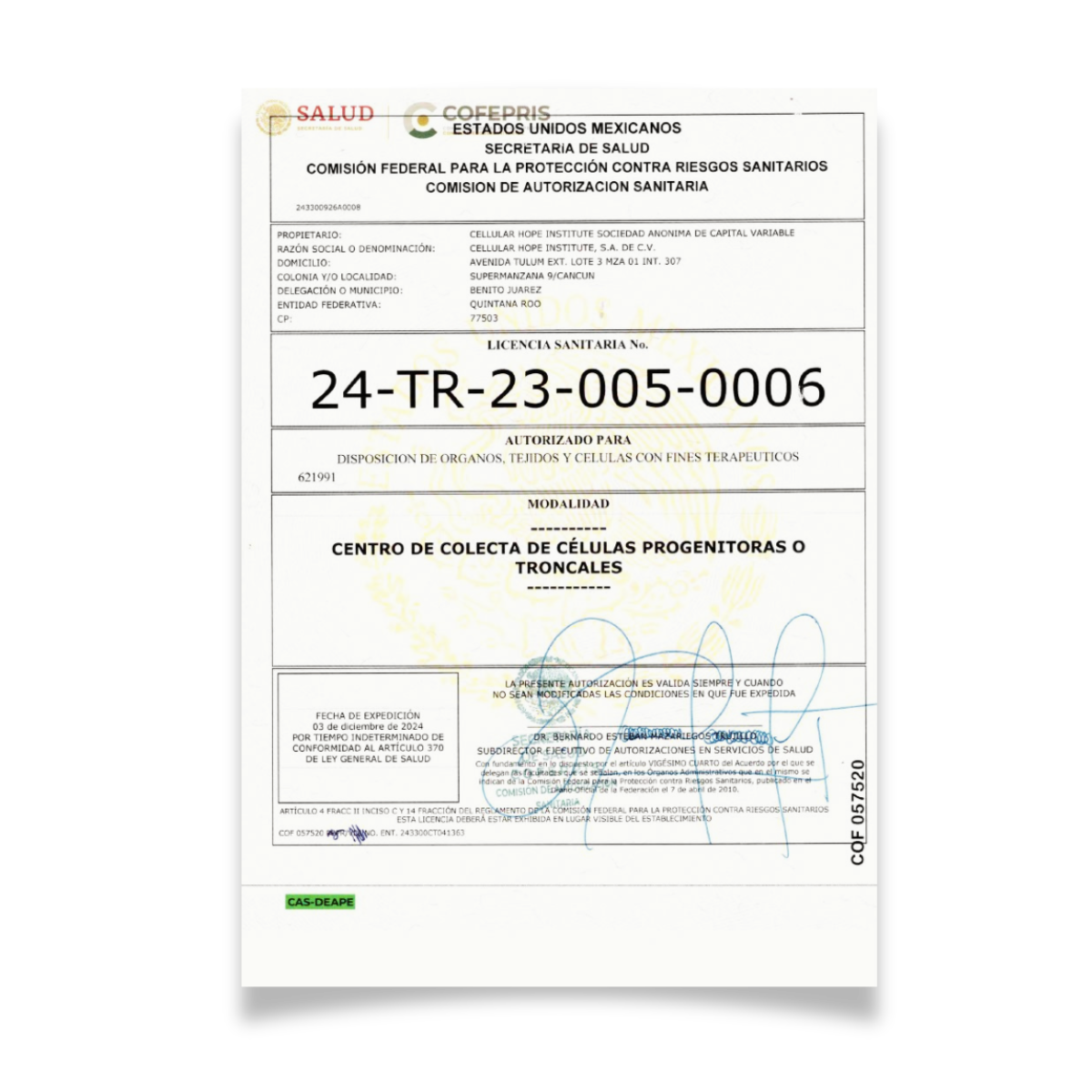 Our clinic proudly holds all three key licenses: for applying, storing, and manufacturing stem cells. These licenses are issued by COFEPRIS, Mexico’s health authority, and they reflect our commitment to meeting the highest safety and quality standards.